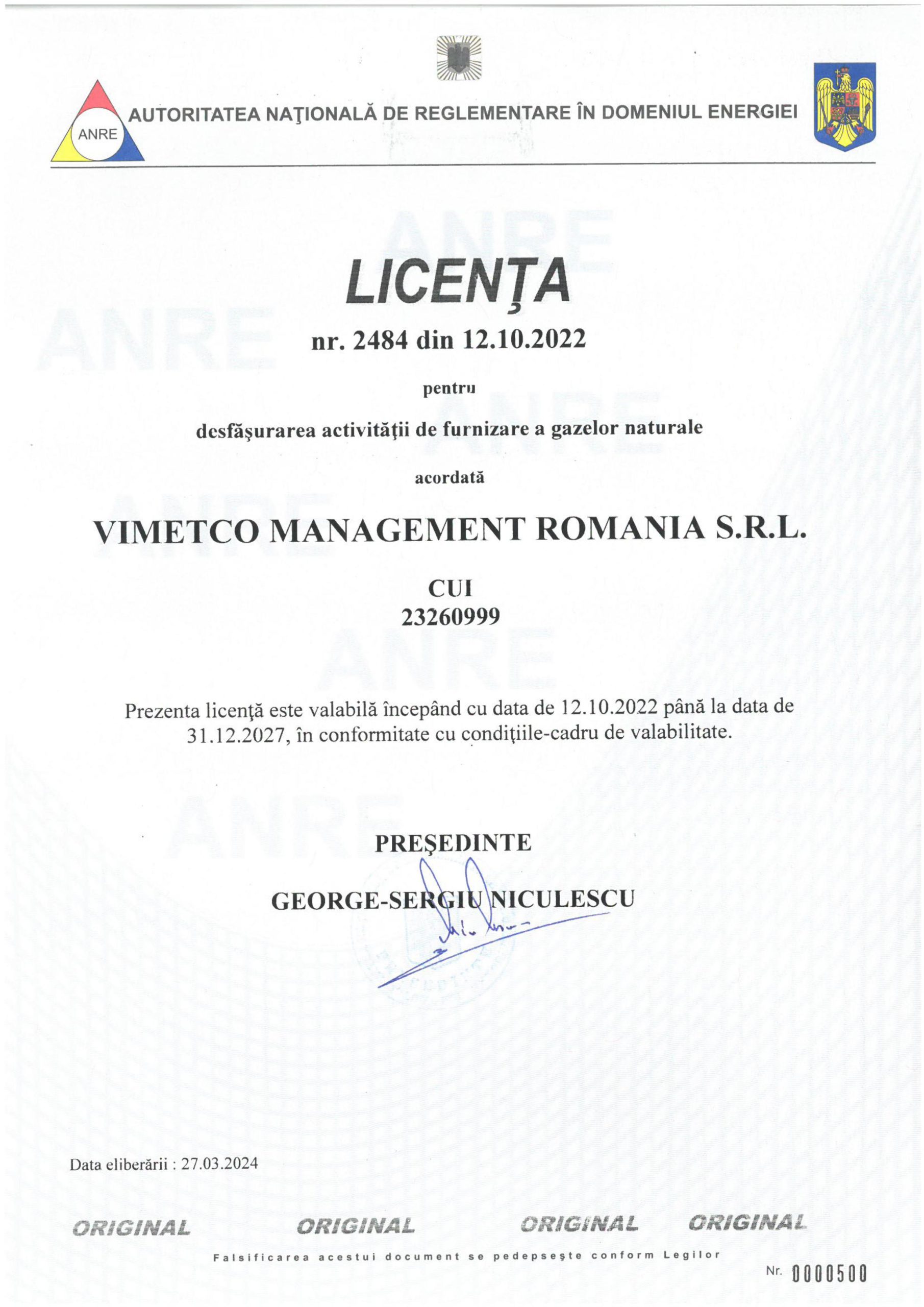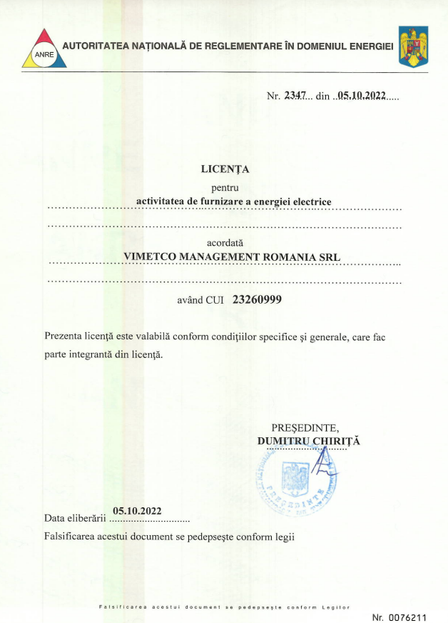 În luna octombrie 2022, Autoritatea Națională de Reglementare în domeniul Energiei a acordat societății noastre, licențele pentru desfășurarea activității de furnizare energie electrică și gaze naturale.